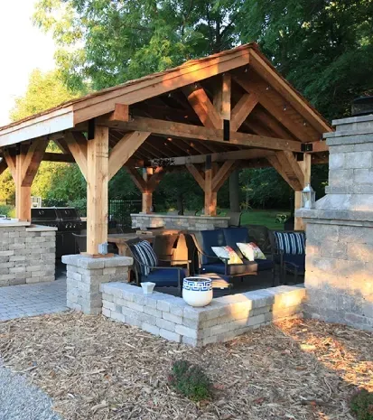 These structures define outdoor rooms while providing shade and architectural interest. Pergolas offer partial coverage perfect for dining areas. Arbors frame walkways and entries. Pavilions create fully covered spaces for furniture and entertainment areas. We build using rot-resistant materials and engineering appropriate for wind and snow loads in our region.